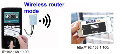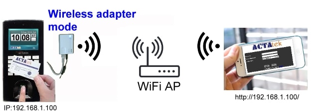 โมดูลไร้สายตามค่าเริ่มต้นจะค้นหาและเชื่อมต่อกับ AP/เราเตอร์ที่มีสัญญาณแรงที่สุด และอนุญาตให้ ACTAtek สื่อสารแบบไร้สายกับ Pocket PC, PDA ที่รองรับ GPRS หรือ Wi-Fi หรือโทรศัพท์มือถือ แล็ปท็อป ฯลฯ ภายในเครือข่าย Wi-Fi