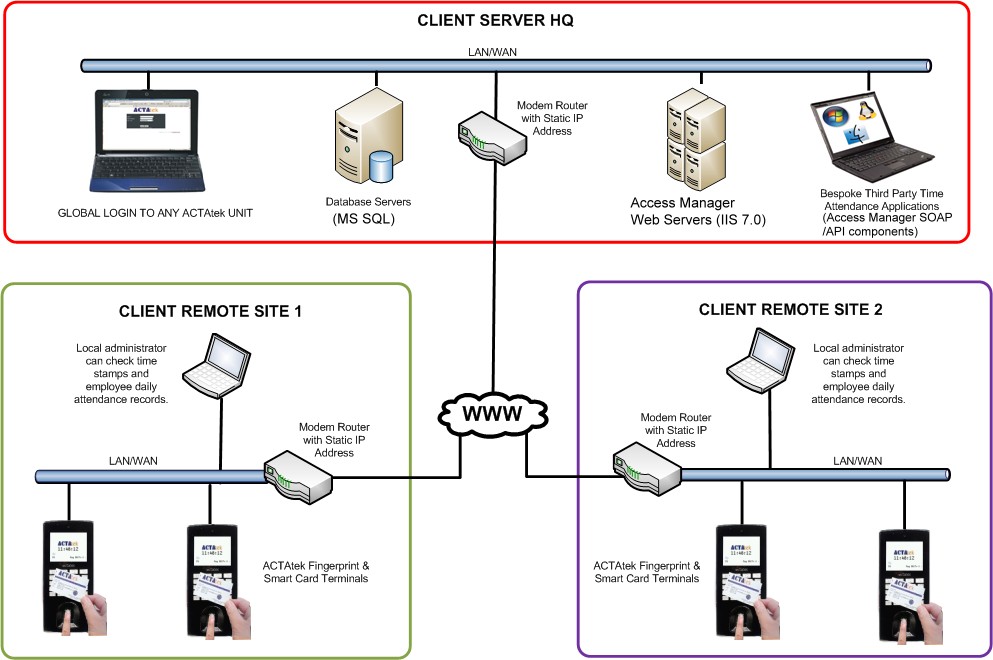 A typical installation diagram shown above is just an example of how software vendors can implement their bespoke Time Attendance solution. Multiple ACTAtek units are deployed with unique IP address to a local network of a remote site. Transaction data is exchanged and synced using either ACTAtek’s middleware solutions or the Software vendor’s bespoke API based on the ACTAtek Access Manager SOAP API to the central server over the Internet. Information is stored on the HQ server where senior managers and administrators can analyse performance and productivity of each remote site to plan and allocate more resources effectively in the future.