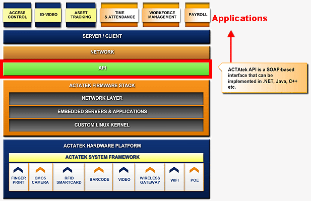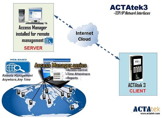 มีตัวเลือก PIN (รหัสผ่าน), สมาร์ทการ์ด และการตรวจสอบลายนิ้วมือแบบไบโอเมตริก ชุดรวม ACTAtek ใช้ในแอปพลิเคชันความปลอดภัย (การควบคุมการเข้าถึง) และการจัดการแรงงาน