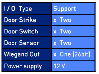 | อินเทอร์เฟซ I/O | – RS-232/RS-485 – เอาต์พุต Wiegand (26 บิต) – กำลังไฟ 12V DC ที่ Max 500mA |